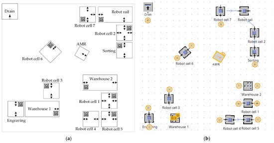 Self-building process for a use case: (a) real system layout and (b) the results of module placement in the simulation model.