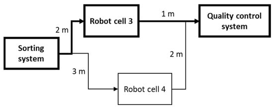 - Route 1: Sorting system → Robot Cell 3 → Quality Control System, giving an overall distance of 3 m (2 m + 1 m = 3 m).
