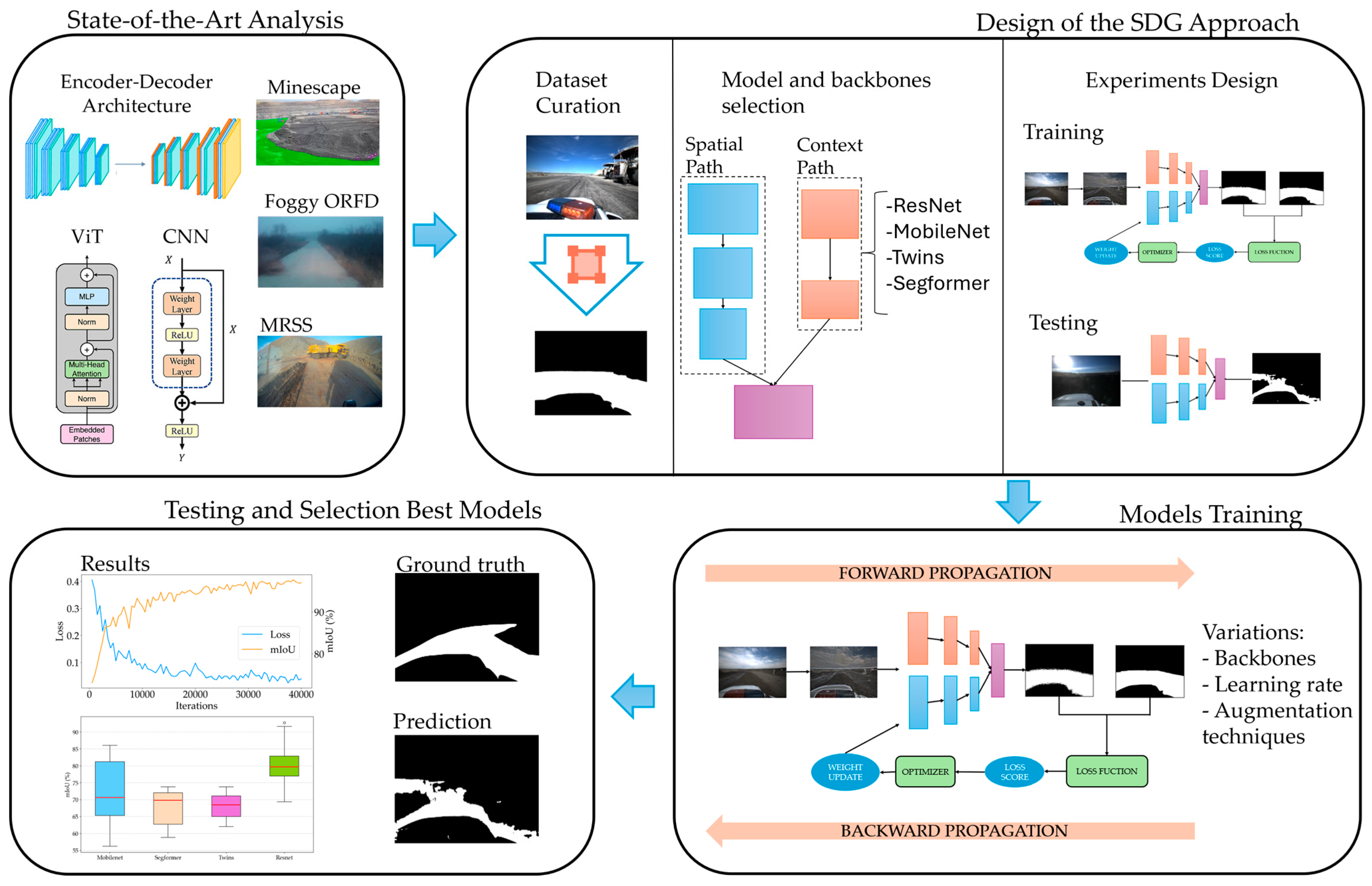 This bibliographic analysis of intelligent systems enabled the definition of the image preprocessing pipeline for autonomous mining applications, hyperparameter selection and training methodology for intelligent perception systems, semantic segmentation models suitable for autonomous vehicle systems, and performance evaluation of intelligent models in target domains under DG modality.