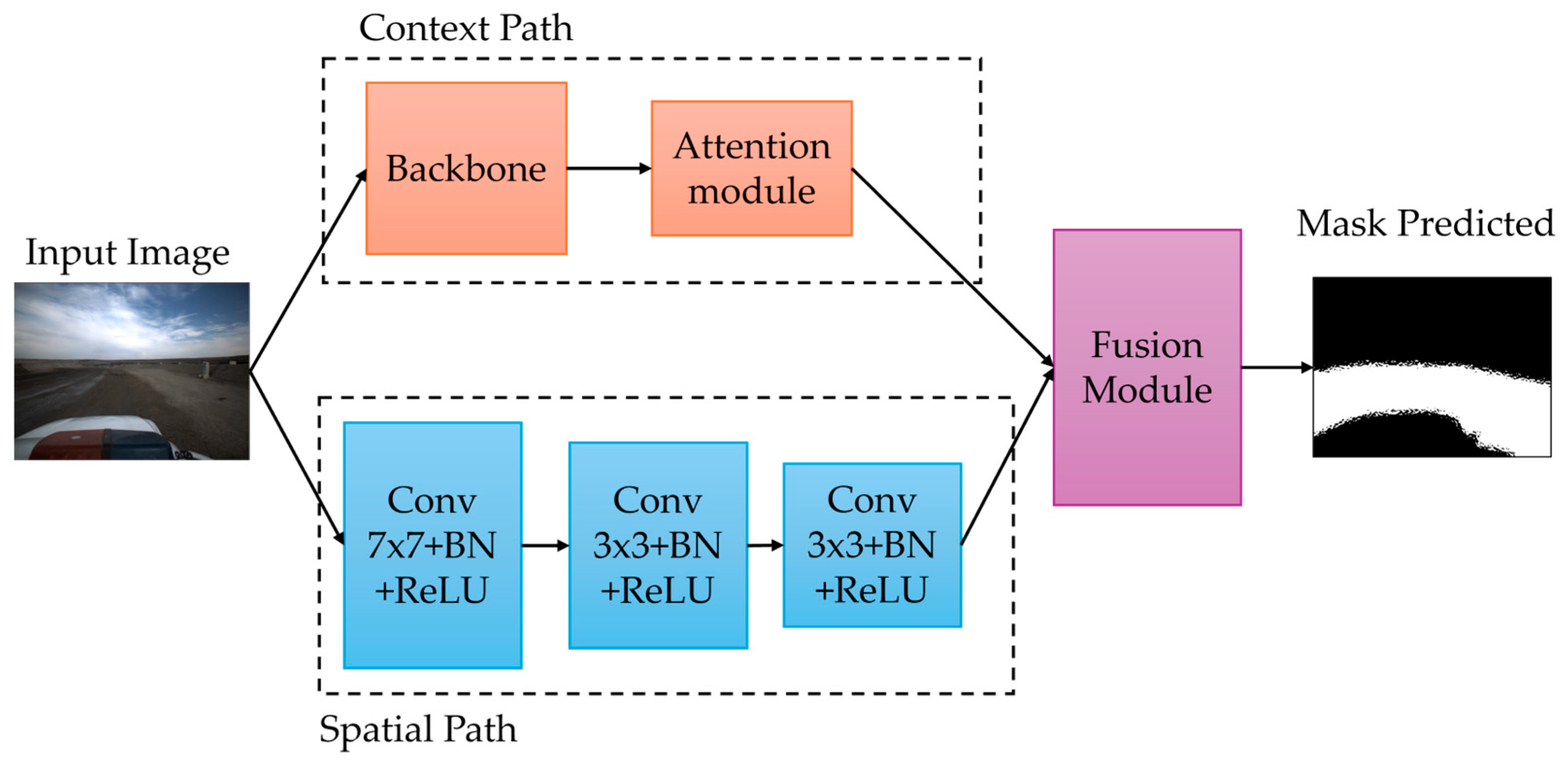 37], CNN, ViT, and MLP-based backbones are tested in the contextual path of the baseline BiSeNet model, where intelligent systems that mix the three methods have shown better performance in capturing high-frequency details while maintaining efficiency and reducing model size for autonomous applications.