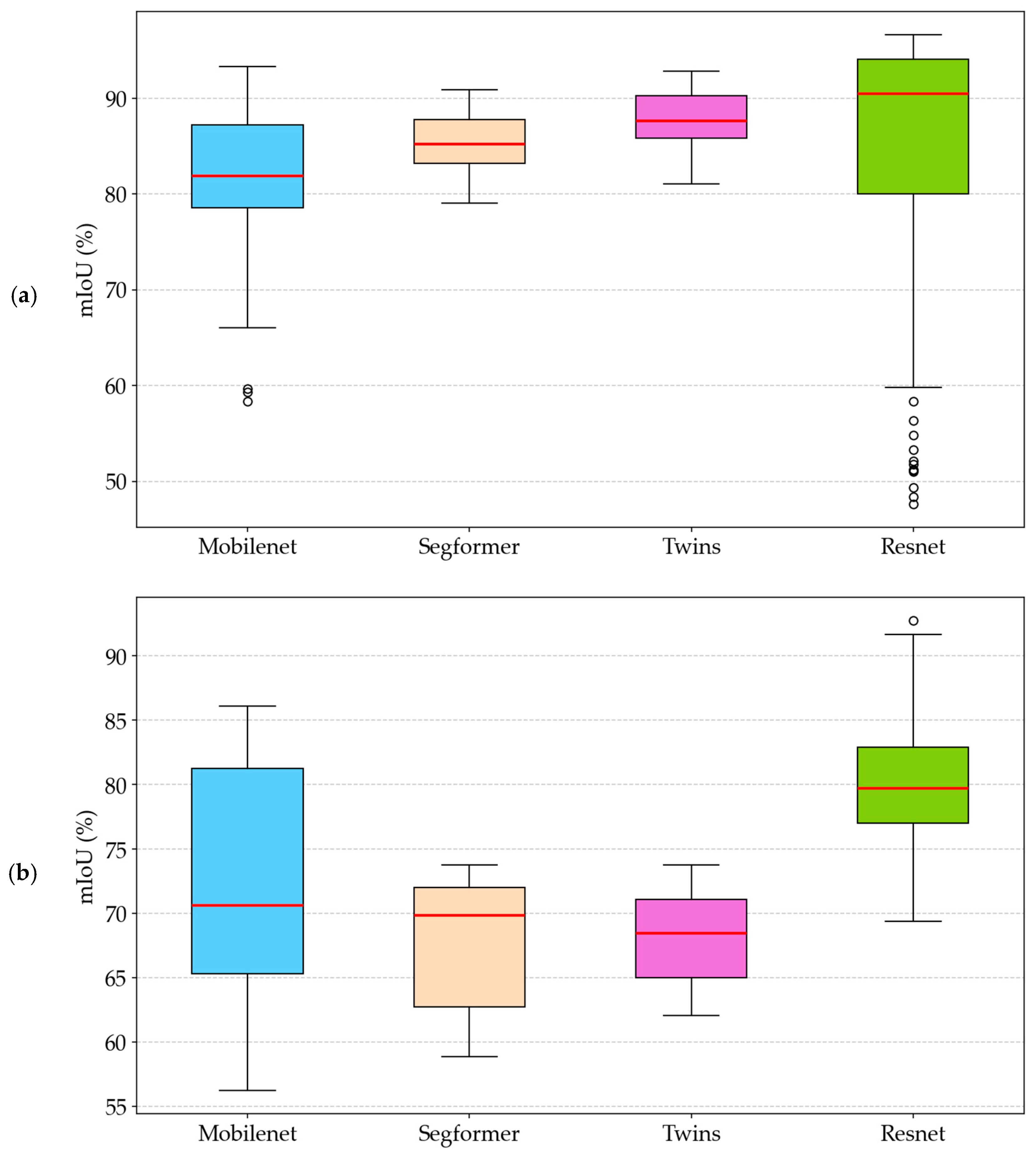 Regarding variability analysis in intelligent autonomous mining systems, LS scenarios revealed that ViTs exhibited significantly lower dispersion (3.07 standard deviation for Twins, 2.98 for SegFormer) compared to ResNet-50 (14.24), indicating more stable behavior under variations within the same degradation type for autonomous applications, albeit with lower overall inference performance in intelligent systems. MobileNetV2 occupied an intermediate position (Std = 7.79), demonstrating greater stability than ResNet-50 but less than ViT for autonomous mining system applications.