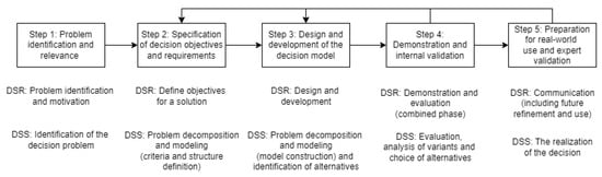 While [96] proposes a six-phase DSR methodology, we opted for a five-phase structure to better align with the decision modeling process [82]. In particular, the demonstration and evaluation phases were integrated into a single step, as they are closely linked in this study. The communication phase is reflected in the final phase, which includes future preparation for the implementation and refinement of the model.