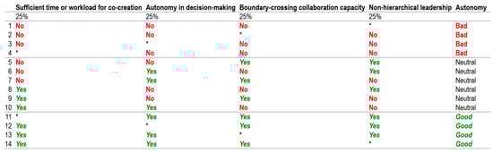 Many authors (e.g., [122,133,134,135]) have identified network governance as the most suitable form of co-creation, as it enables a broader form of co-creation with service users and other stakeholders. Due to the complex interaction of multiple stakeholders working towards different outcomes [136], a one-size-fits-all approach with one-size-fits-all solutions does not work as it cannot take into account the different needs and preconditions of stakeholders [111,137,138]. Flat organizational hierarchies are particularly beneficial as they reduce bureaucratic distance, encourage participation at all levels of the organization and promote more flexible, inclusive and responsive co-creation processes. Such hierarchies appear to encourage a greater focus on building relationships with service users, which is essential for building trust in co-creation [139]. Ref. [140] also found that flat hierarchies are a key factor in promoting effective co-creation in mental health recovery programs. In contrast, traditional bureaucratic structures characterized by administrative silos, long chains of command and institutional isolation are poorly suited for co-creation. They hinder the development of collaborative spaces across organizational boundaries [141]. To overcome this, co-creative governance systems should build on dialogic practices that reduce hierarchical power imbalances and promote the personal engagement of different actors [142]. Informal, horizontal forms of authority based on relational dynamics and leadership are more conducive to such governance [141].