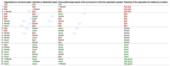 In our content analysis, we found that almost 70% of the articles referred directly or indirectly to co-creation factors. In most cases, the authors did not refer to them as drivers and barriers, but as problems and opportunities that influence the co-creation process. Refs. [24,70] divided the identified drivers and barriers into three groups: (1) structural/organizational drivers/barriers, (2) drivers/barriers related to internal (public organizations) co-creators and (3) contextual drivers/barriers. They mentioned two additional categories (“external co-creator” and “quality of relationship between co-creators”) that were excluded from the cleaned version of the drivers and barriers as they did not directly or indirectly relate to organizational aspects of the public organization, i.e., its characteristics and capacities. They felt that such a systematization was best suited to determine which drivers and barriers were relevant to the organizational structure of a public institution.