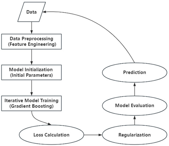 In the process of model construction, this study selected the XGBoost algorithm as the core model [38,39]. To improve performance, this study draws on the feature engineering ideas of generative AI to generate new features to enrich the dataset and enhance the model’s diversity and predictive accuracy. Figure 1 shows its workflow.