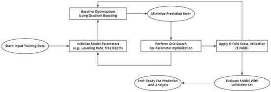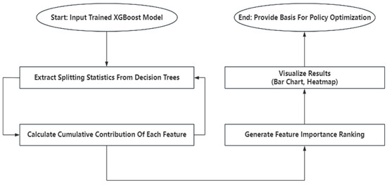 The analysis process of this study includes three stages: data input and model training, model prediction, and feature importance mining. First, the training set is input into the XGBoost model, and the gradient boosting algorithm is used for iterative optimization. The optimal parameters (learning rate 0.05, tree depth 4, subsampling rate 0.9, feature sampling rate 0.8, and L2 regularization parameter 1.5) are determined by combining grid search and cross-validation. Subsequently, five-fold cross-validation is used to improve model stability, and the average result is finally used as the performance indicator. After training is completed, the validation set is used for independent evaluation to ensure that the model has good generalization ability, providing a basis for subsequent prediction and feature importance analysis. Figure 3 shows the overall process of this stage.