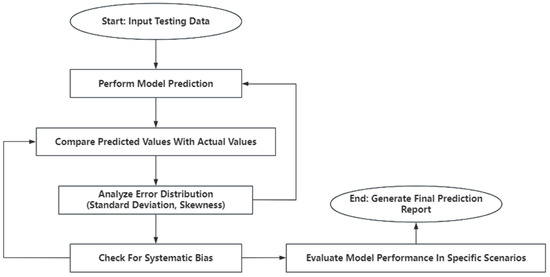 In addition, to verify the reliability of the prediction results, the error range between the predicted value and the actual value is analyzed, including calculating the standard deviation and skewness of the error distribution, evaluating whether the model has systematic deviations, and exploring the performance differences of the model in certain specific scenarios based on the error analysis results. Figure 4 shows the workflow of the model prediction stage.