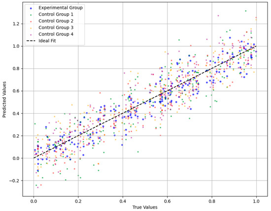 In Figure 6, the predicted values of the experimental group are evenly distributed on both sides of the diagonal line, which are relatively close to the diagonal line, with only a few predicted values deviating from it, indicating that the experimental group model achieves a better fitting effect. In contrast, although the predicted values of the other control group models are also on both sides of the diagonal line, they deviate slightly further, indicating that their fitting effect is worse than that of the experimental group.