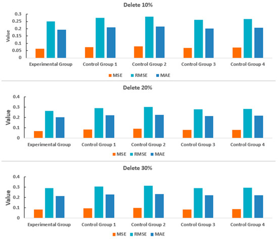 The experimental results of feature deletion noises show that with the increase in noise intensity (from 10% to 30%), the MSE, RMSE, and MAE of each group of models all show different degrees of increase, indicating that the prediction precision decreases with the increase of noise (Figure 7). However, the performance of the experimental group is always better than that of other control groups under all noise intensities. For example, under 30% noise intensity, the MSE of the experimental group is 0.085, the RMSE is 0.291, and the MAE is 0.217, which are all lower than those of the other control groups, indicating that it can still maintain high precision in a noisy environment.