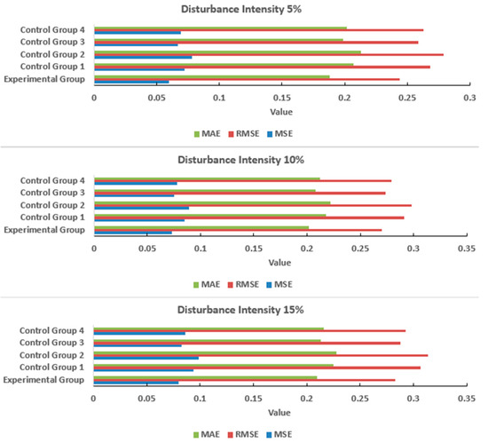 In the experiment with disturbance noises added (Figure 8), the robustness of the experimental group is still the strongest. Although the errors of all models increase as the disturbance intensity increases, the error increase of the experimental group is always small, suggesting that it has a strong ability to adapt to noises. Overall, the experimental group model shows the best robustness under two different types of noise interference. Whether it is feature deletion noise or adding disturbance noise, it can effectively reduce the decline in prediction precision and show strong anti-interference ability.