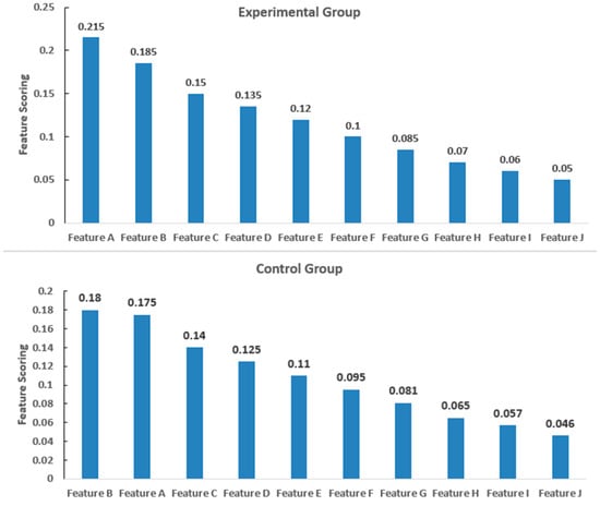 According to the comparison between the experimental group’s scores and the average scores of the control groups shown in Figure 9, the importance scores of the first 10 features of the XGBoost model in the experimental group are evenly distributed and high. The importance scores of features A and B of the model are 0.215 and 0.185, respectively, and the contribution of other features is also significant. This suggests that the XGBoost model can effectively distinguish the influence of each feature and generate a feature ranking with high credibility. The performance of the model in feature importance analysis provides a solid theoretical basis for subsequent model optimization and feature selection.