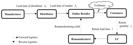 There are three prominent characteristics of the flow of information in online CLSC systems involving returning and replacing. First, in online CLSCs, product replacement tends to enlarge the actual demand encountered by the e-tailer and subsequently transmits a signal of elevated demand to upstream suppliers [6]. As the misdirected signal travels upstream, it distorts the genuine dynamics of market demand, thereby amplifying bullwhip effects and inflating inventory costs [7]. Second, online retailers possess an informational edge due to their access to supplementary product return details, as well as market demand statistics [8]. Online retailers need to optimize their information sharing (IS) decisions by figuring out the effect of their product return and replacement quantities on supply chain efficiency. To delineate the information flow in online CLSCs, this study optimizes IS decisions in four distinct IS mechanisms: no information sharing, demand information sharing, return and replacement information sharing, and full information sharing. Third, in conventional brick-and-mortar retailing, customers are able to directly return purchased items to physical stores. In contrast, online consumers must first send returns to a logistics center. The time delay in this process exacerbates the degree of information distortion [9]. Consequently, the return lead time in reverse logistics, as a significant operational factor, has an impact on the performance of online CLSCs. Due to the time delay in reverse logistics, returned products will affect the inventory level and ordering decisions of online retailers. Specifically, the interplay between the return lead time and an e-tailer’s lead time significantly affects demand forecasts, thereby giving rise to distinct supply chain models. We assess the effects of IS through examining two supply chain scenarios: (1) the return lead time exceeds the retailer’s replenishment lead time; (2) the return lead time is less than the replenishment lead time.