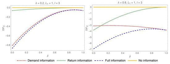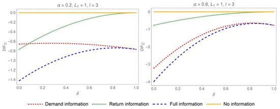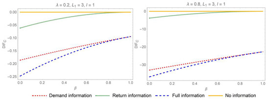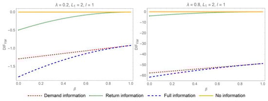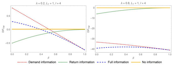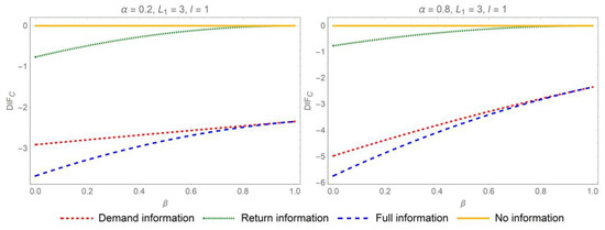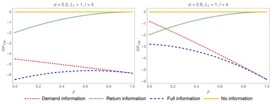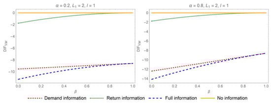 Proposition 1 suggests that sharing demand or return information mitigates the bullwhip effect when . Specifically, when both categories of information are disclosed concurrently, the distributor will experience the most significant reduction in the bullwhip effect. In pursuit of mitigating the bullwhip effect and curbing information distortion, the most advantageous strategy for IS in the online CLSC is comprehensive IS. As a result, bolstering collaborative efforts among the various stakeholders in online CLSC is imperative. The influence of parameters on the differences of ordering variances when is depicted in Figure 2 and Figure 3.