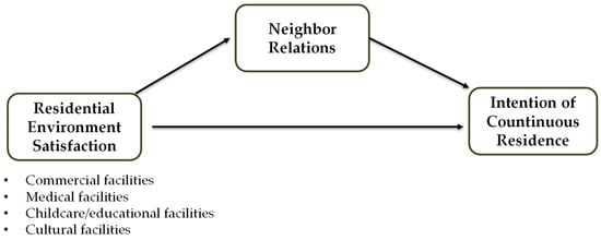 Some studies suggest that neighbor relations may mediate the relationship between residential environment satisfaction and the intention of continuous residence. According to Lewicka [16], higher satisfaction with the residential environment leads to more frequent use of local spaces, increasing interpersonal interaction and trust among residents. This process enhances community satisfaction and, ultimately, intention of continuous residence. Empirical studies have treated neighbor relations both as a dependent variable influenced by the residential environment satisfaction [18,19,20] and as an independent variable affecting intention of continuous residence [14,16,17]. If both relationships are valid, neighbor relations can be considered a mediating factor between residential environment satisfaction and intention of continuous residence.