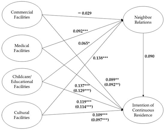 To further test the significance of the mediation, bootstrapping was employed (Table 8). Following Preacher et al. [47], mediation is deemed statistically significant if the 95% confidence interval for the indirect effect does not include zero. The bootstrapping results confirmed significant indirect effects of neighbor relations in the relationships involving satisfaction with medical facilities, childcare/educational facilities, and cultural facilities, but not in the relationship involving commercial facilities. Specifically, the indirect effects were 0.008 for medical facilities, 0.005 for childcare/educational facilities, and 0.012 for cultural facilities, with the largest indirect effect observed for cultural facilities. This underscores the role of cultural facilities in fostering social connectedness, which in turn contributes to residents’ intention of continuous residence. Finally, the relationships among the variables are presented in Figure 3.