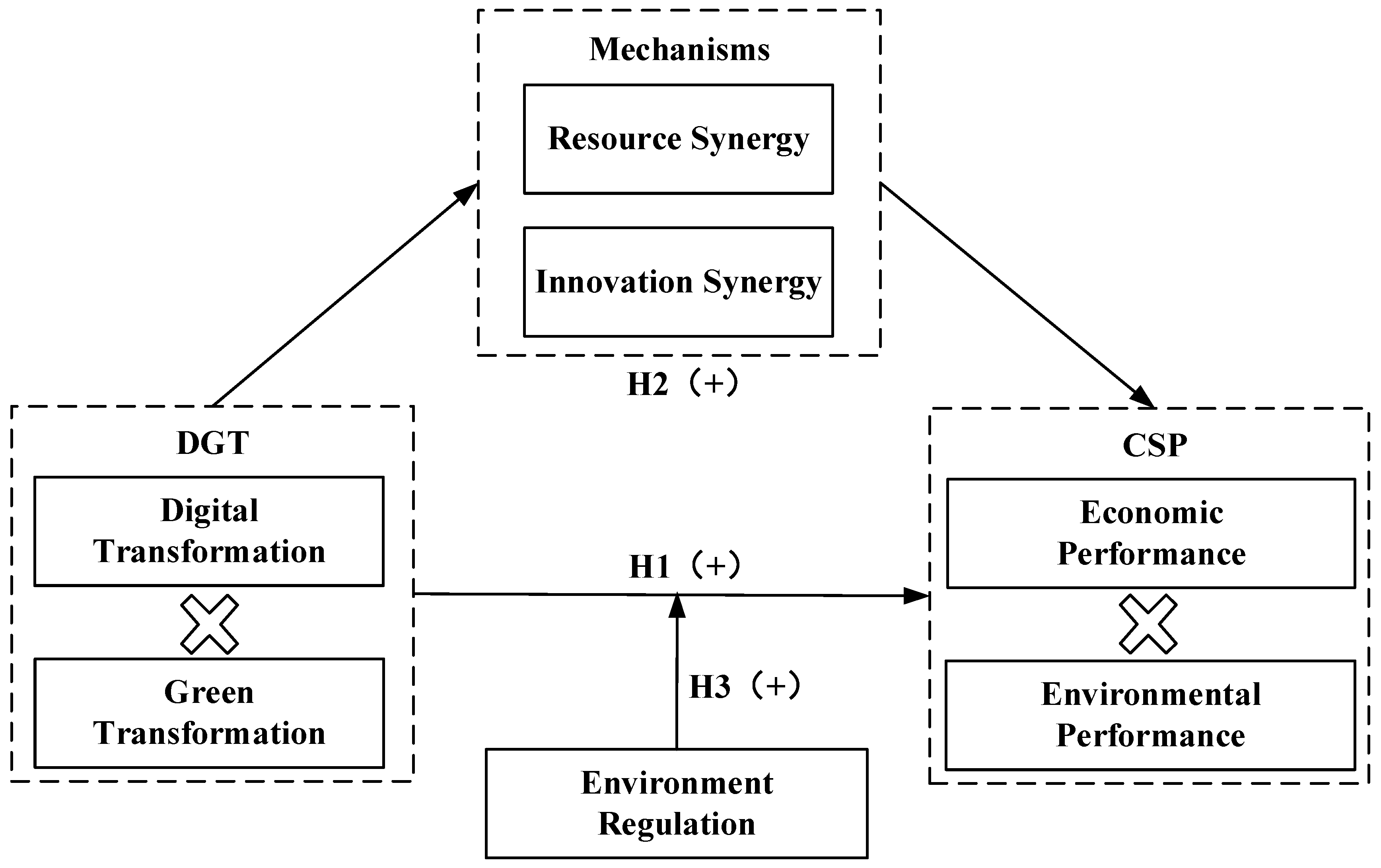 25]. Second, it transcends the limitations of a singular transformation perspective by revealing the impact mechanism of DGT on CSP from a synergistic standpoint, thereby filling a critical gap concerning the interactive mechanisms between DGT and CSP. Third, it introduces environmental regulation as a moderating variable to clarify the contextual boundaries within which DGT exerts its effects, providing empirical evidence to inform differentiated and targeted transformation policies.