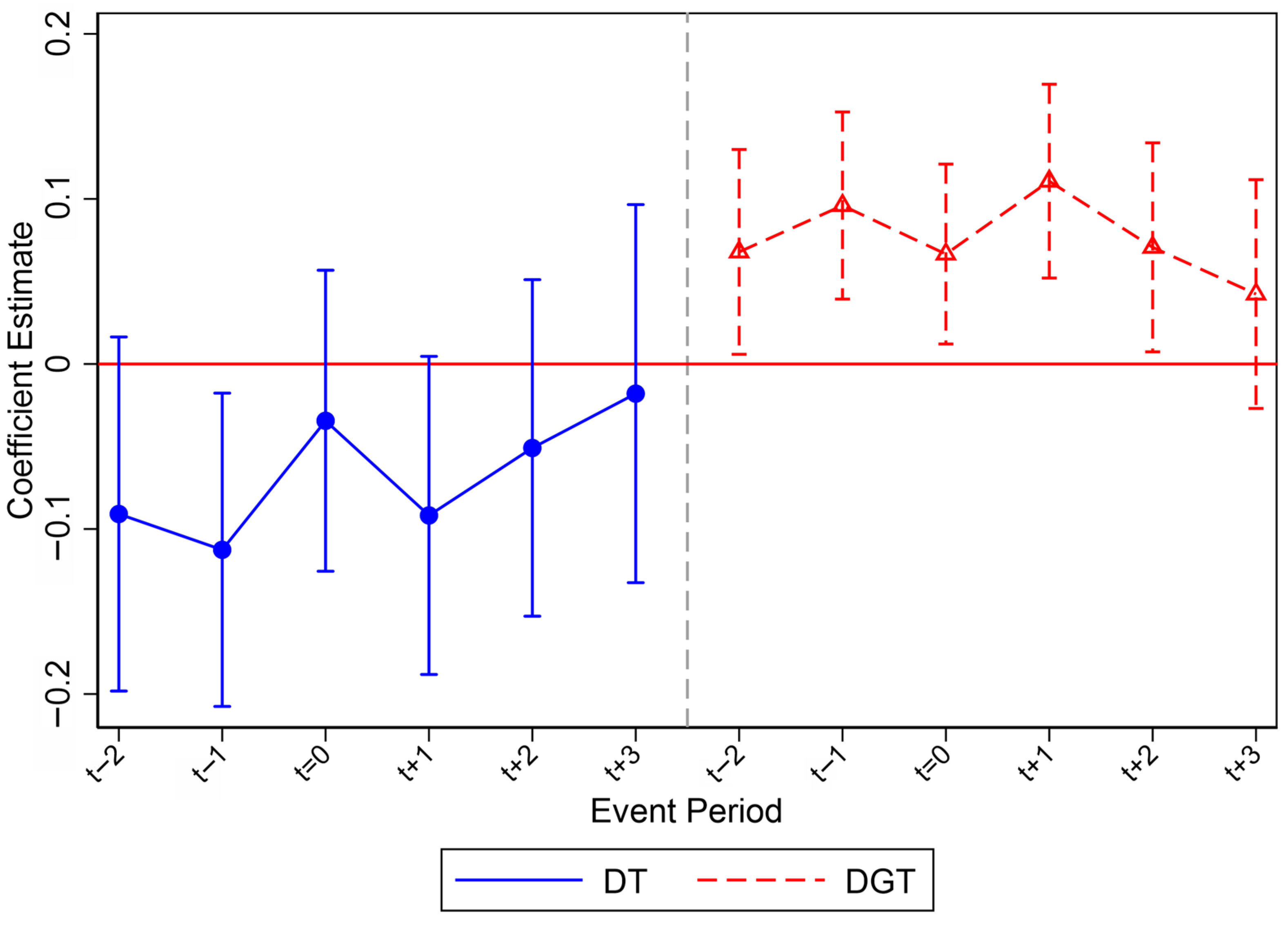 Second, DGT improves CSP by alleviating financing constraints, optimizing resource allocation, expanding knowledge breadth, and enhancing innovation quality through resource and innovation synergy mechanisms. Moreover, two further insights enrich our theoretical understanding. On the one hand, the efficiency-enhancing effect of DGT is more pronounced in state-owned enterprises, suggesting that DGT not only facilitates resource reallocation but also leverages resource advantages to overcome organizational inertia, thereby generating greater efficiency gains. On the other hand, the temporal dynamics of innovation indicate that DGT primarily accelerates short-term innovation quality and diffusion, but contributes less to sustaining long-term, high-impact innovations. This dual mechanism aligns with the literature on rapid diffusion and substitution effects, offering greater operational and theoretical precision to our conclusions.