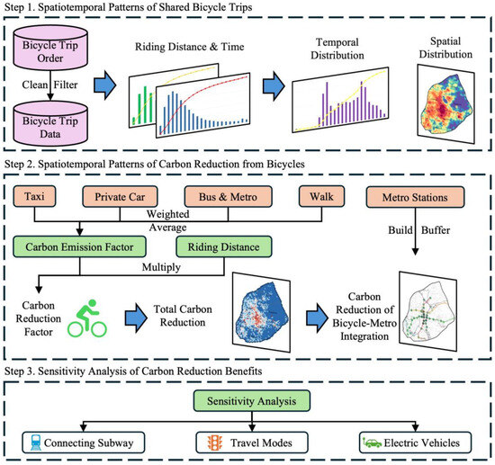 Thus, green and low-carbon travel was made a cornerstone of urban sustainable development [1]. In this context, micro-mobility modes represented by shared bicycles have rapidly diffused across cities owing to their convenience and flexibility, representing a pivotal solution to the first-mile/last-mile problem and contributing positively to alleviating traffic congestion and improving air quality [2]. In addition to reducing carbon emissions, shared bicycles can also significantly lower the environmental noise associated with traffic, yielding synergistic benefits for urban livability [3]. In recent years, shared bicycles have developed rapidly in China. Statistics indicate that shared bicycles have become an important supplementary mode of short-distance travel for urban residents, with daily travel volumes in some large cities accounting for about 5% of total transportation trips [4]. At the same time, the impact of shared bicycles is expanding globally, with rapid promotion and adoption observed in Europe, the Americas, and Southeast Asia [5]. Against the backdrop of rising motor vehicle ownership and mounting transportation emission pressures, systematically quantifying and evaluating the carbon reduction benefits of shared bicycles not only help to reveal their spatio-temporal mechanisms within cities but also provides empirical evidence and methodological references for green transportation policies on a global scale.