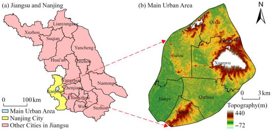 Study area: (a) Jiangsu province; (b) main urban area.