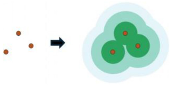 Buffer analysis is a commonly used technique in spatial analysis, which creates buffer zones around a point, line, or polygon features at a specified distance to identify the extent of influence or to evaluate potential effects within a designated area. Buffers can be single buffers or multi-ring buffers. This study employs a multi-ring buffer approach to analyze the usage of shared bicycles within different radius ranges around metro stations, and to further estimate the carbon reductions from shared bicycles that dock with the metro. Figure 3 illustrates the concept of constructing multi-ring buffers around point features.