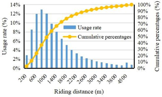 Travel distance and travel time are key indicators for characterizing the overall features of shared-bicycle travel. In the core urban area of Nanjing, the average travel distance and average travel time for shared bicycles are 1287.21 m and 8.70 min, respectively, indicating that shared bicycles are predominantly used for short trips. As shown in Figure 4, approximately 34.88% of trips have distances between 600 m and 1200 m, and more than 72.79% of trips are shorter than 1600 m. This suggests that the deployment of shared bicycles significantly enhances daily short-distance mobility, effectively fills the transportation gap for urban short trips, and plays an important role in addressing the “first mile” and “last mile” challenges.