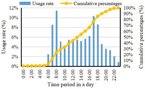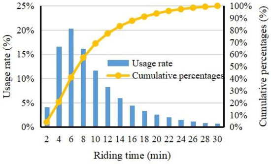 Compared with travel distance, the distribution of travel time exhibits more pronounced characteristics, clearly highlighting the advantage of shared bicycles for short-distance trips. As shown in Figure 5, about 65.00% of travel times fall within 2 to 10 min; when travel time exceeds 10 min, the number of trips declines rapidly, and 87.72% of travel times do not exceed 16 min, indicating that users tend to choose faster modes of transport for longer distances. In contrast, trips with travel times below 2 min account for less than 5.00%, suggesting that when the destination is close, the frequency of shared-bicycle use is relatively low and its advantage is less apparent. Overall, in scenarios characterized by long walking times, moderate cycling times, and high driving costs, shared bicycles become the preferred option due to their low cost, high flexibility, and convenience. Shared bicycles can help users reach destinations quickly in a short time, thereby highlighting their unique value as a tool for short-distance travel.