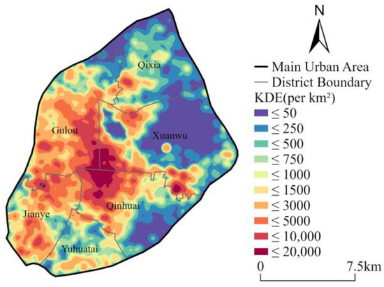 To investigate the spatial distribution characteristics of shared-bicycle trips, this study adopts a kernel density estimation (KDE) approach to analyze the spatial distribution pattern by examining the density of trip origins and destinations. The results shown in Figure 7 indicate that shared-bicycle trips are mainly concentrated in the central and western parts of Nanjing’s core urban area, while the distribution in the northeast is relatively sparse.