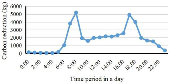 Figure 8 presents the temporal distribution of carbon reductions from shared bicycles. From a temporal perspective, the reductions exhibit two pronounced peaks corresponding to the morning (07:00–09:00) and evening (17:00–19:00) commuting rush hours. Specifically, the morning peak accounts for 9.01 t and 21.14% of the daily total carbon reductions, while the evening peak accounts for 8.91 t and 20.90%. Overall, reductions during the two peak periods constitute 42.04% of the daily total, underscoring the important role of shared bicycles in urban commuting. This time distribution aligns with the temporal pattern of bicycle trip distributions and further validates the commuting nature of shared bicycles.