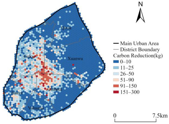 Figure 9 shows the spatial distribution of carbon reductions from shared bicycles. The spatial pattern of carbon reductions is closely related to the spatial distribution of bicycle trips: the reductions are concentrated in population-dense areas and central zones with high commercial activity, while the reductions are comparatively lower around scenic spots and peripheral areas. This distribution effectively reflects the notable role of shared bicycles in optimizing short-distance urban travel, alleviating traffic congestion, and reducing carbon emissions.