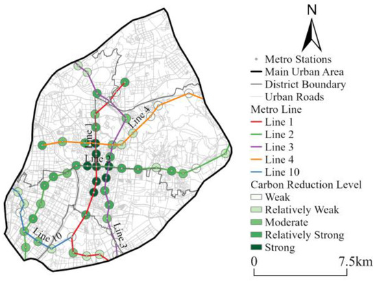 With a buffer radius of 50 m (Table 2), the area accounts for only 0.92% of the core urban area; yet it contributes 1.92 t of carbon reductions, representing 4.51% of the city’s total shared-bicycle carbon reductions. Expanding the buffer radius to 100 m increases the area to 2.84%, and the corresponding carbon reductions rise to 3.89 t, rising to 9.13% of the total. When the radius is further expanded to 200 m, the area share becomes 8.94%, and carbon reductions markedly increase to 7.92 t, amounting to 18.58% of the total. Thus, although the spatial coverage of the buffers is small, their carbon reduction contributions are substantially higher than those of ordinary regions, indicating that shared bicycles serving as feeder modes to the metro exhibit higher carbon reduction efficiency per unit area, and highlighting the environmental benefits of coordinated travel between shared bicycles and rail transit.