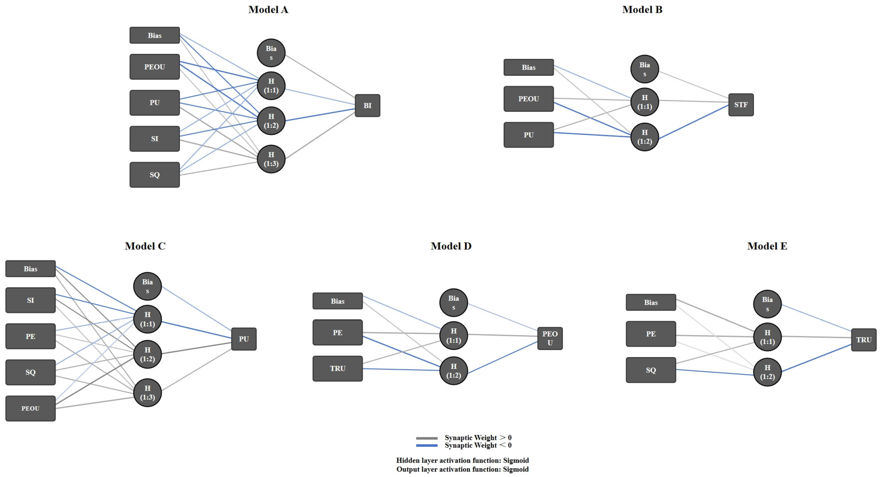 Model A (Input: PU, SI, SQ, PEOU; Output: BI) | Model B (Input: SQ, PEOU; Output: STF) | Model C (Input: SI, PE, SQ, PEOU; Output: PU) | Model D (Input: PE, TRU; Output: PEOU) | Model E (Input: PE, SQ; Output: TRU) | ||||||