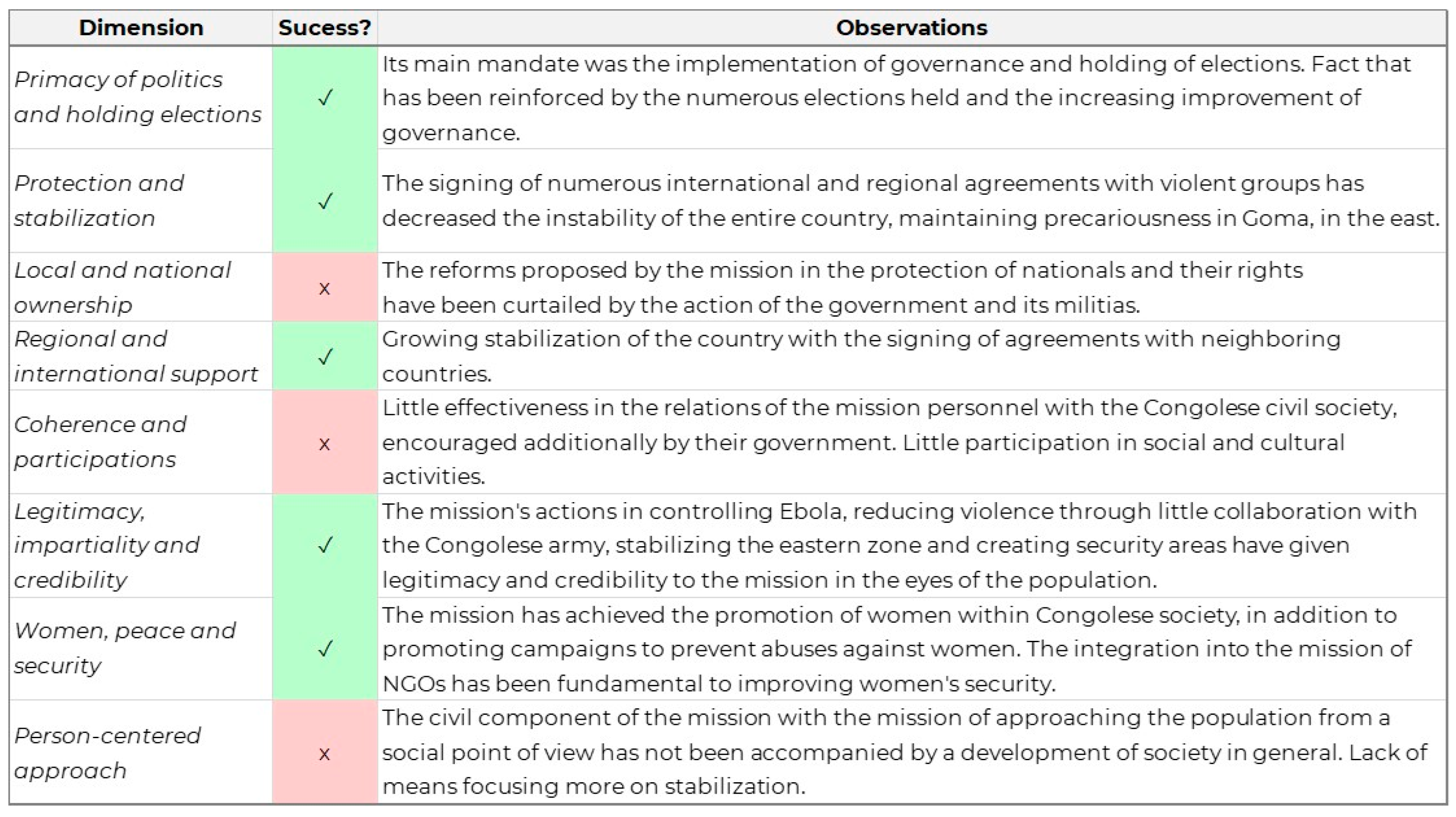 - Analyze mission success by assessing the performance of each peace operation according to eight dimensions derived from United Nations and NUPI studies [66,67,68,69]: political primacy and electoral organization, security and transition, national and international ownership, regional and international support, coherence and commitment, legitimacy and impartiality, women and children, and a people-centered approach.
