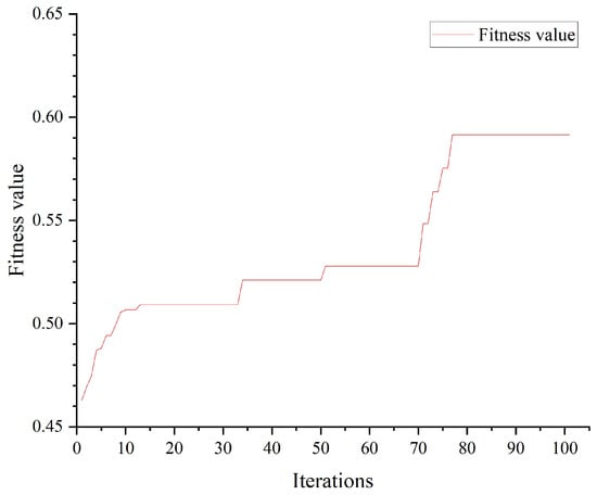 The proposed algorithm is implemented in Python 3.11.5 and executed on a HP (Beijing, China) desktop equipped with 4.2GHz 13th Gen Intel® Core™ i5-13400 processor and 32GB RAM. After 100 iterations, the optimization process converged, achieving a final fitness value of 0.5914. The convergence curve is illustrated in Figure 12.