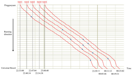 Except for the last train on each line, the skipping rate of other trains is controlled within the range of (0.10, 0.15], skipping 2–3 stations on average. Figure 13 illustrates the spatial distribution of skipped stations for down direction of Line 1. It involves 36 stations, including 13 non-skipping stations (i.e., transfer stations and terminals). A total of five trains are scheduled on this line during the study period. In the figure, the blue dots represent the stations skipped by each train. It can be observed that the skip-stop patterns vary across trains and are primarily concentrated in the downstream segment of the line.