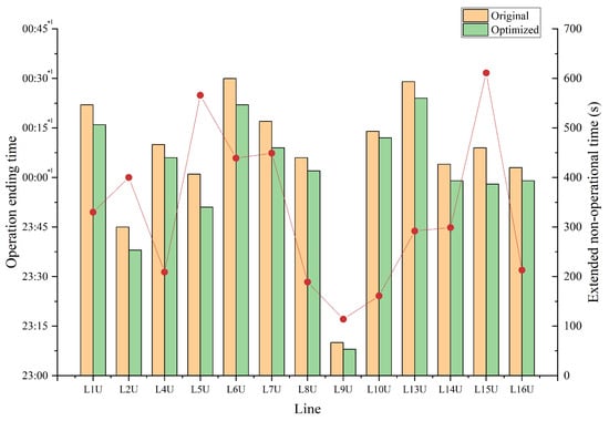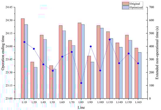 Table 4 shows that across the entire network, the cumulative extension of non-operational time exceeds 2.3 h, which can be redistributed among maintenance teams to reduce nighttime staffing pressure and improve operational safety. Moreover, the optimization results lead to a system-wide advancement in operation ending times, as illustrated in Figure 14 and Figure 15. The results reveal that 11 lines now complete operations before midnight compared to 6 originally, thus easing coordination pressure and increasing the overlap of available maintenance windows across lines. These improvements offer tangible benefits for infrastructure health and long-term sustainability, despite their seemingly small numerical values.