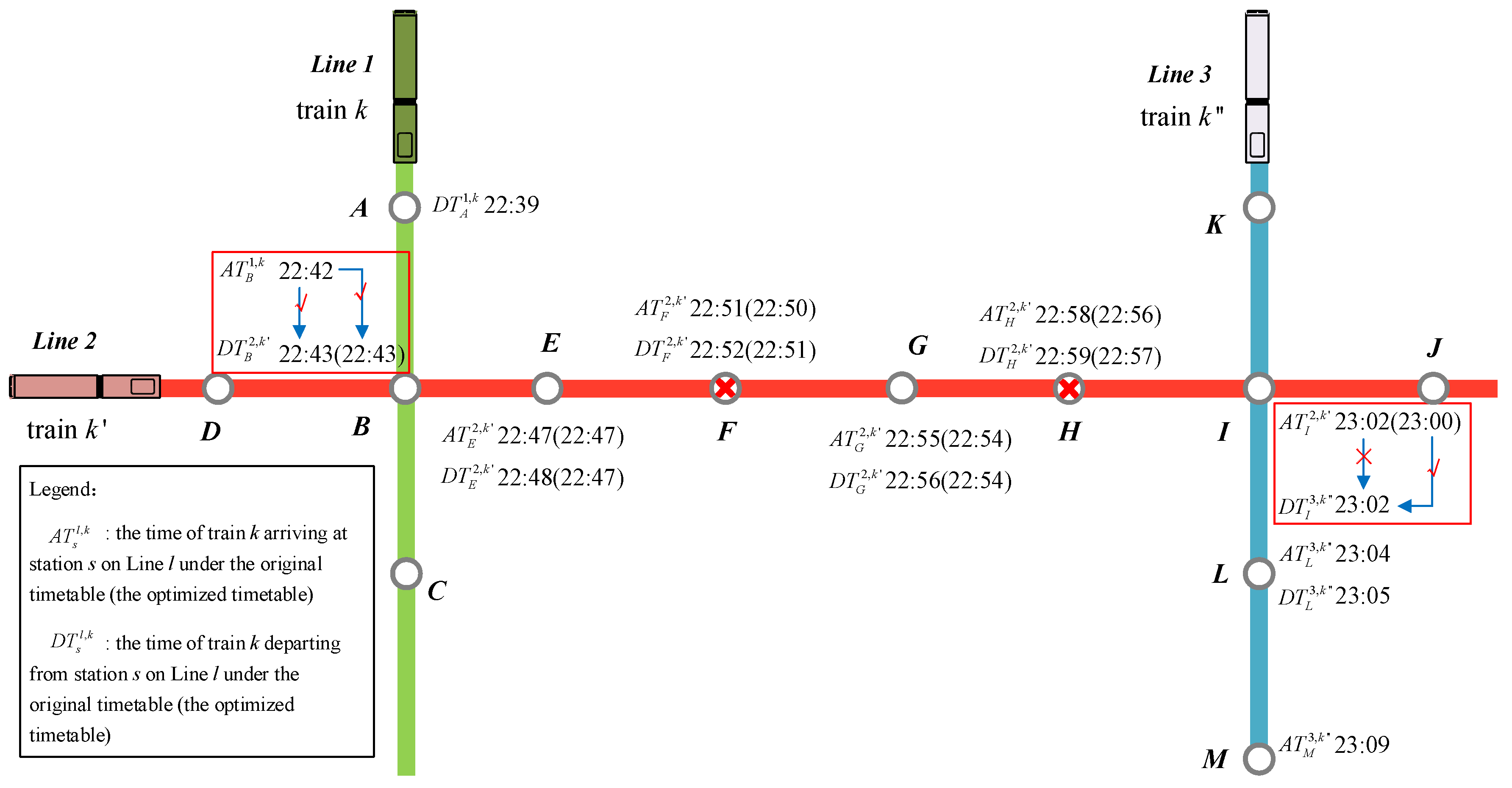 - Zhang, Q.; Li, X.; Yan, T.; Lu, L.; Shi, Y. Last train timetabling optimization for minimizing passenger transfer failures in urban rail transit networks: A time-period based approach. Physica A 2022, 605, 128071. [Google Scholar] [CrossRef]
