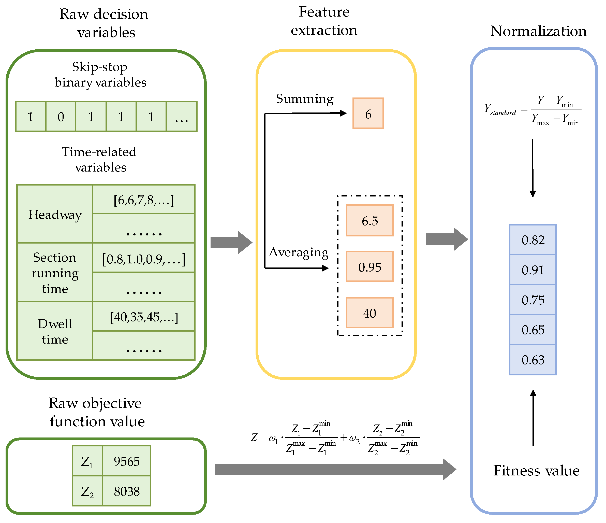 - Data preprocessing: From the stratified pool, a final dataset of 10,000 distinct samples is constructed. To improve model robustness, duplicate or highly similar solutions are filtered out to prevent data leakage or overfitting. Finally, all input features are dimensionally compressed and normalized according to the method in Figure 3. The corresponding objective values are normalized and aggregated into a unified composite score used as training labels.