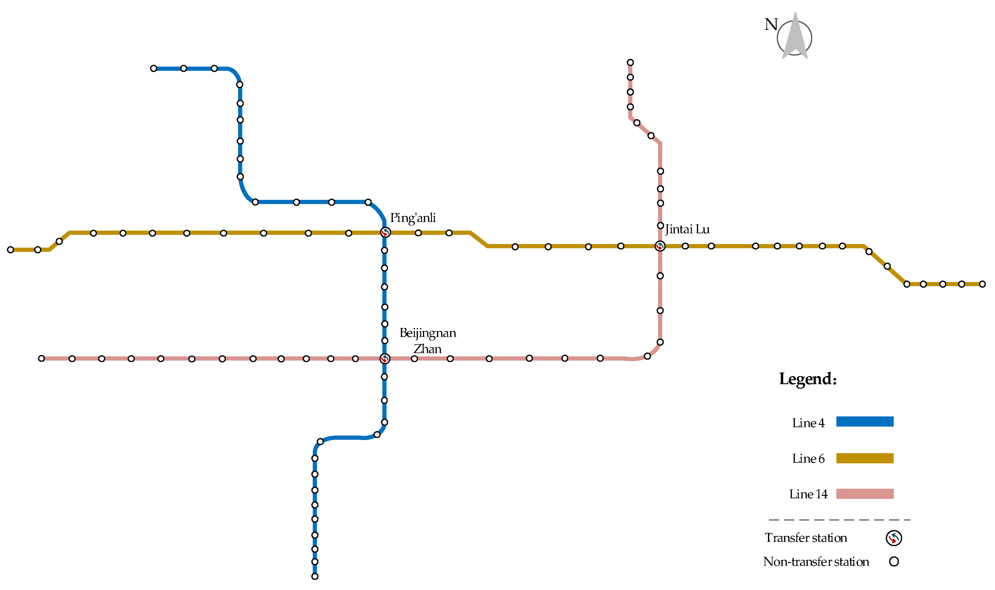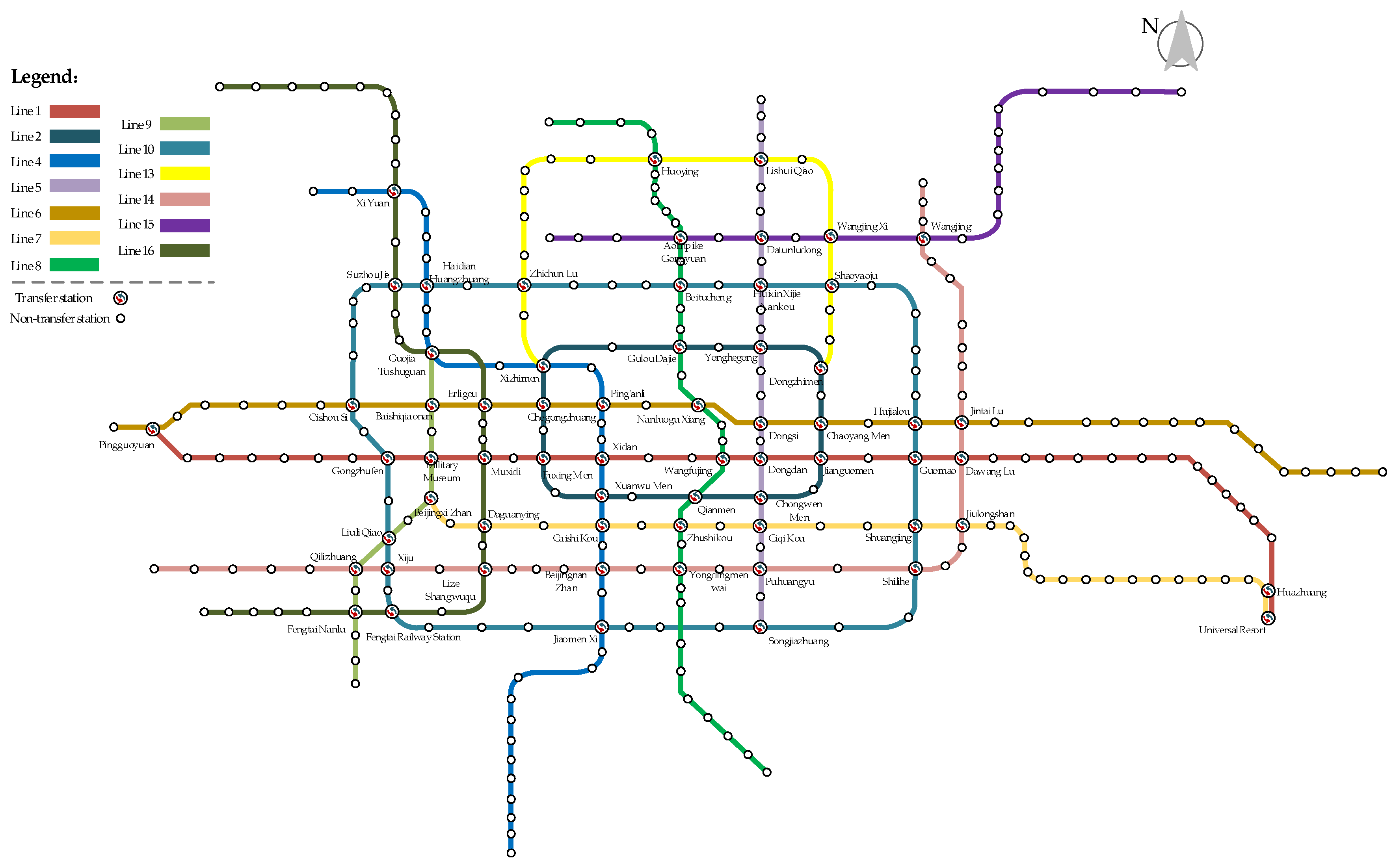 - Kang, L.; Wu, J.; Sun, H.; Zhu, X.; Gao, Z. A case study on the coordination of last trains for the Beijing subway network. Transp. Res. Part B Methodol. 2015, 72, 112–127. [Google Scholar] [CrossRef]