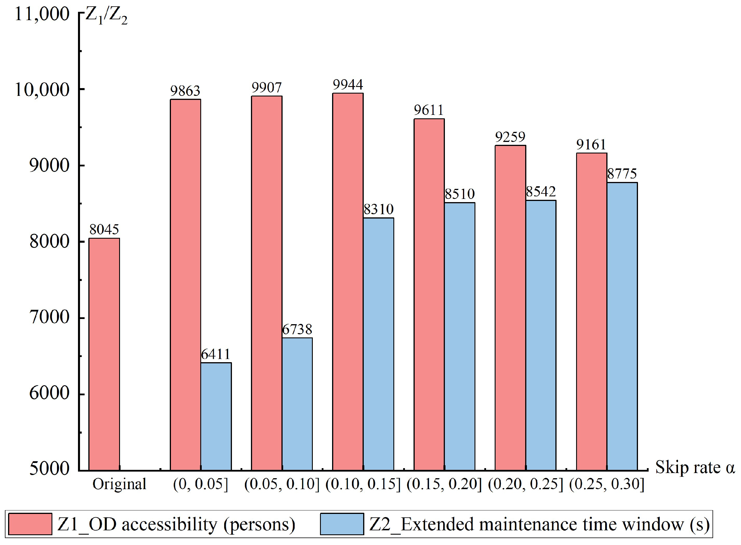 - A comprehensive case study based on the Beijing metro network—covering 13 bidirectional lines, hundreds of stations, and thousands of OD pairs—demonstrates the effectiveness and scalability of the proposed approach. The results show substantial improvements in both OD accessibility and maintenance time, while the proposed GWO-CNN algorithm reduces computational time by 98.4% compared to conventional metaheuristics.