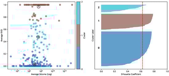 To preselect the test universe in a rule-based manner, this study applies k-means clustering [47] to a two-dimensional feature set comprising each asset’s average KVSI and the log of average daily trading volume. The clustering is fitted on statistics from the training window (2021–2023), and in the test year (2024) assets are assigned to the fixed centroids to prevent information leakage. The silhouette index [48] is used to assess the structural validity of the universe selection.