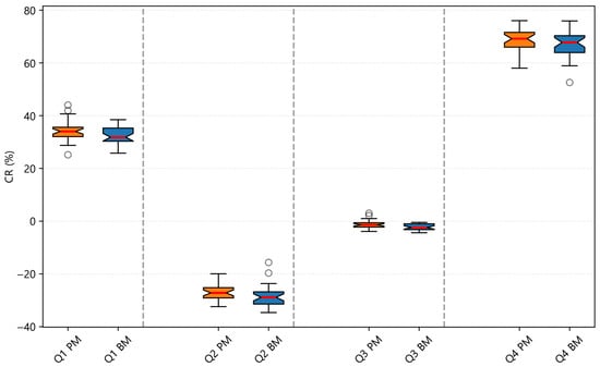 | Q3 | CR (%) | −4.76 ± 1.52 | −5.75 ± 1.16 | +0.99 pp |