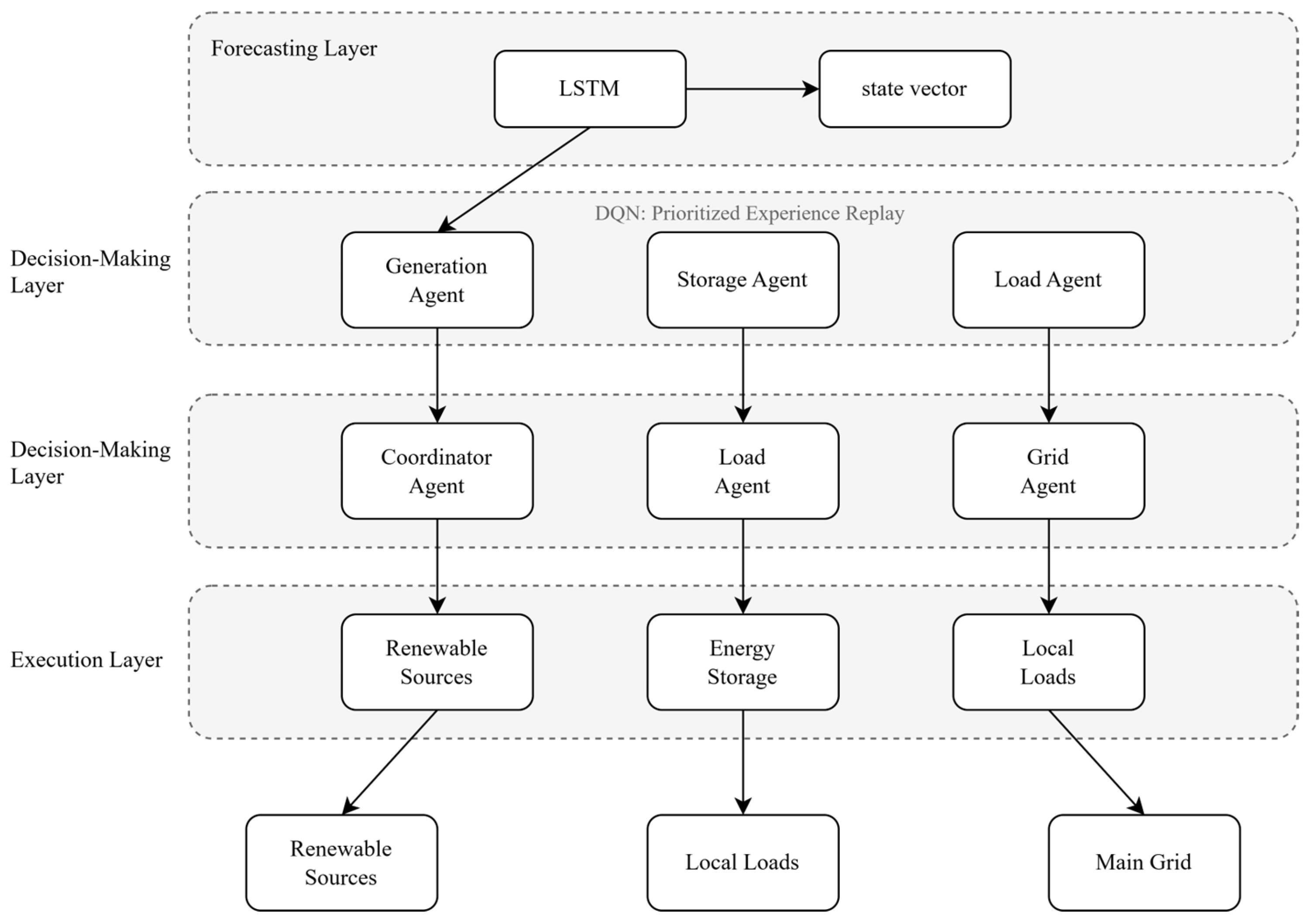 Multi-Agent Architecture: GreenMind employs specialized agents responsible for distinct operational tasks—generation dispatch, storage management, load balancing, and grid interaction—enabling decentralized decision-making while maintaining global optimization coherence.