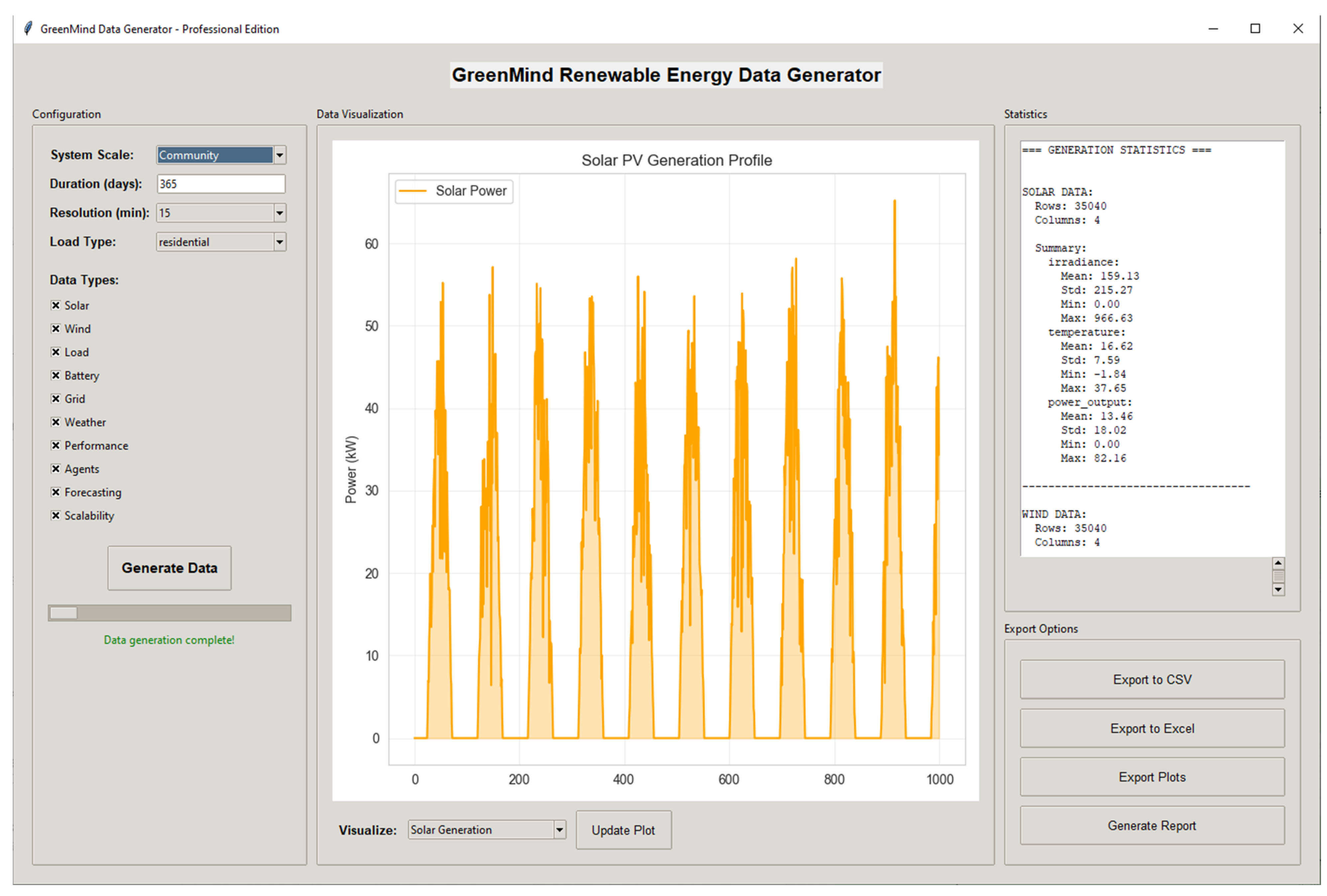 The GreenMind Renewable Energy Data Generator provides a comprehensive graphical user interface (GUI) designed to facilitate systematic data collection, visualization, and analysis for hybrid renewable energy systems, as shown in