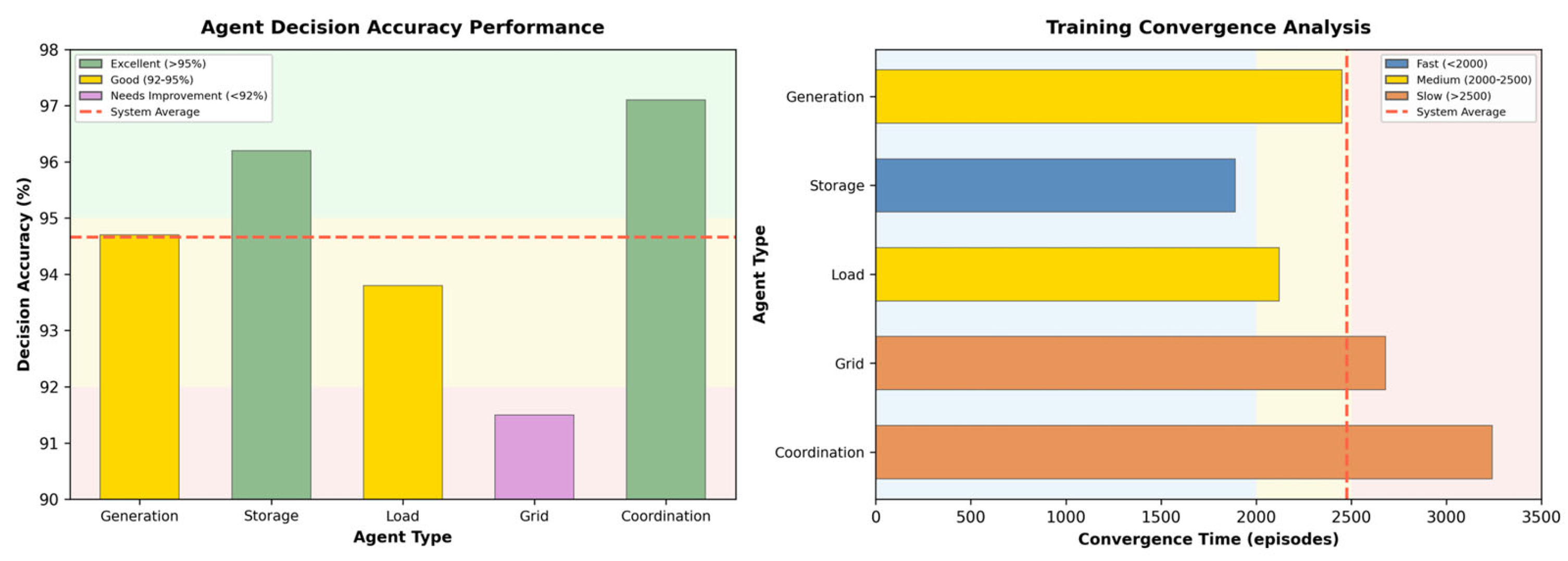 Table 4 demonstrate that the specialized agent architecture achieves superior performance across multiple metrics. The Storage Agent exhibits the highest decision accuracy (96.2%) and fastest adaptation speed (98 steps), reflecting the relatively deterministic nature of energy storage operations. The Coordination Agent, despite having the longest convergence time (3240 episodes), achieves the highest reward stability (variance: 0.012) and overall decision accuracy (97.1%), validating the effectiveness of the hierarchical coordination mechanism. The system-wide average performance metrics confirm the robustness of the multi-agent approach, with overall decision accuracy exceeding 94.7% and manageable communication overhead of 20.9 kbps per agent.