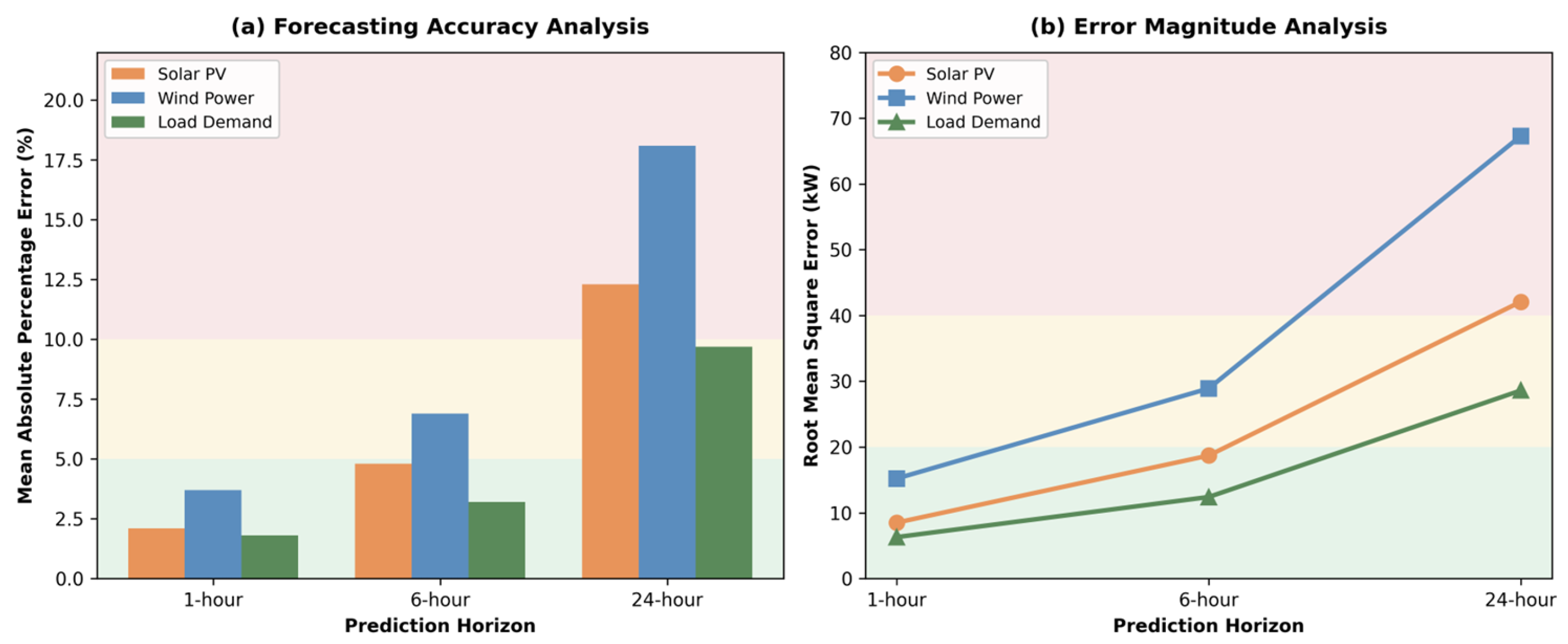 Table 6 demonstrate exceptional accuracy across all prediction horizons and energy sources. The Load Demand forecasting achieves the highest accuracy with 1.8% MAPE for 1 h predictions, reflecting the relatively predictable nature of consumption patterns. Solar PV forecasting maintains strong performance with 2.1% MAPE for short-term predictions, enabling effective solar generation scheduling. Wind Power forecasting, while more challenging due to wind variability, still achieves acceptable accuracy levels of 3.7% MAPE for 1 h predictions. The average system performance of 2.7% MAPE for 1 h predictions significantly outperforms conventional forecasting methods and directly contributes to improved dispatch decision quality.
