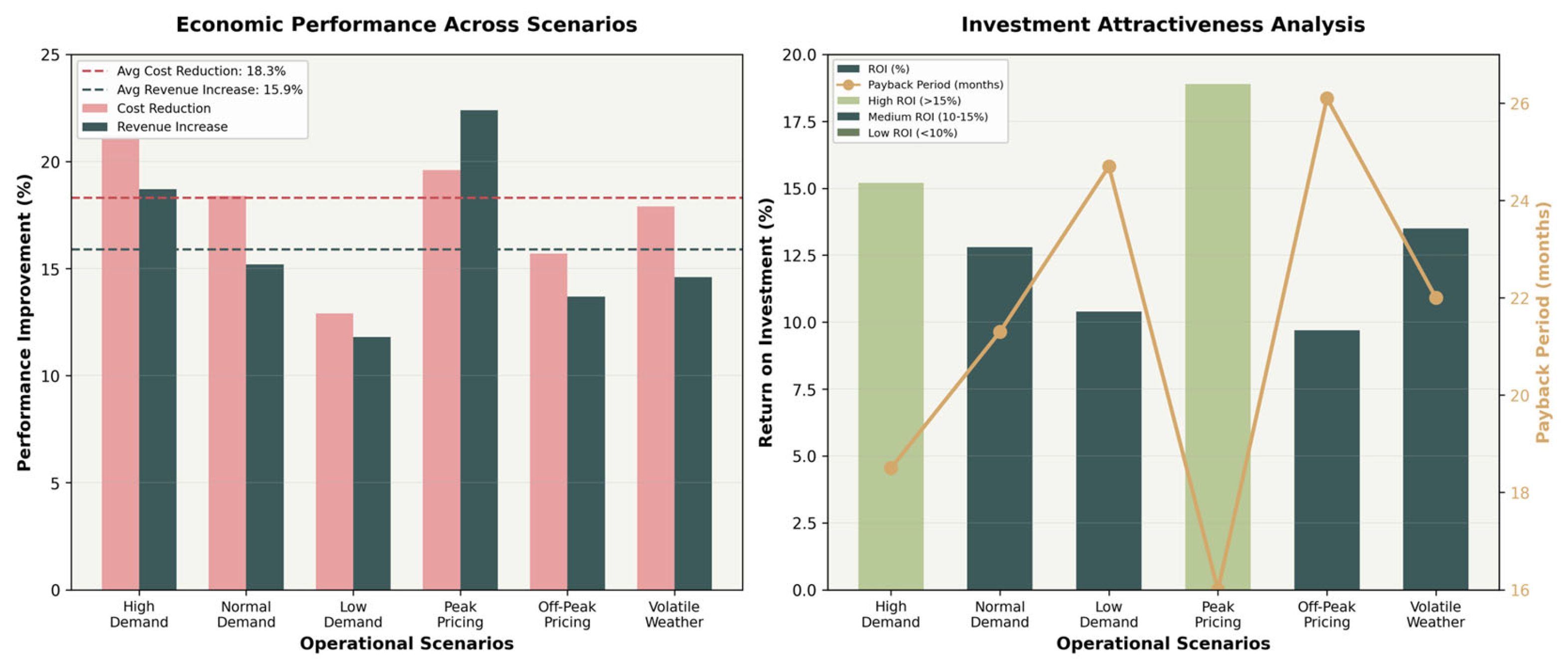 The economic performance evaluation focuses on operational cost reduction, revenue optimization, and return on investment metrics. The GreenMind framework’s ability to balance multiple economic objectives while maintaining system reliability represents a key advancement over existing approaches.