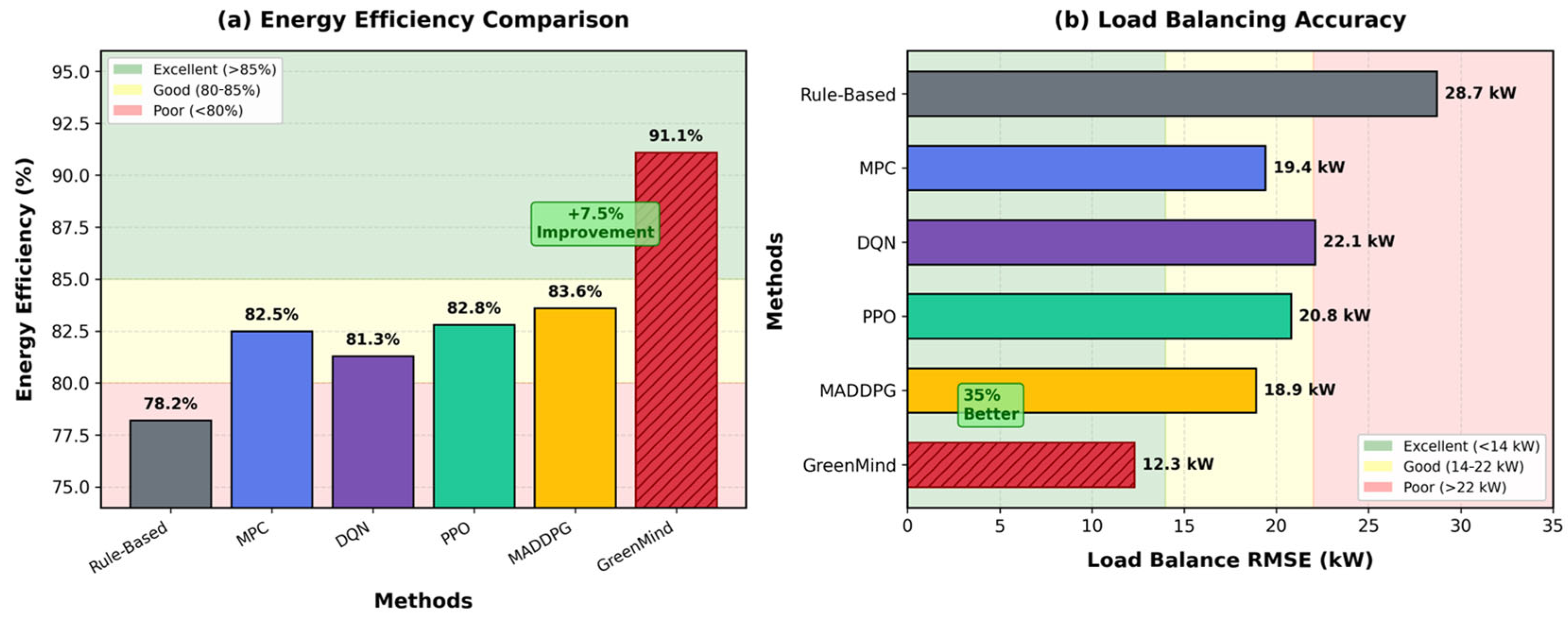 Figure 8 shows that compared to traditional and DRL-based methods, GreenMind shows superior energy efficiency (91.1%) and the lowest RMSE (12.3 kW) in load balancing—44% better than the next best approach.
