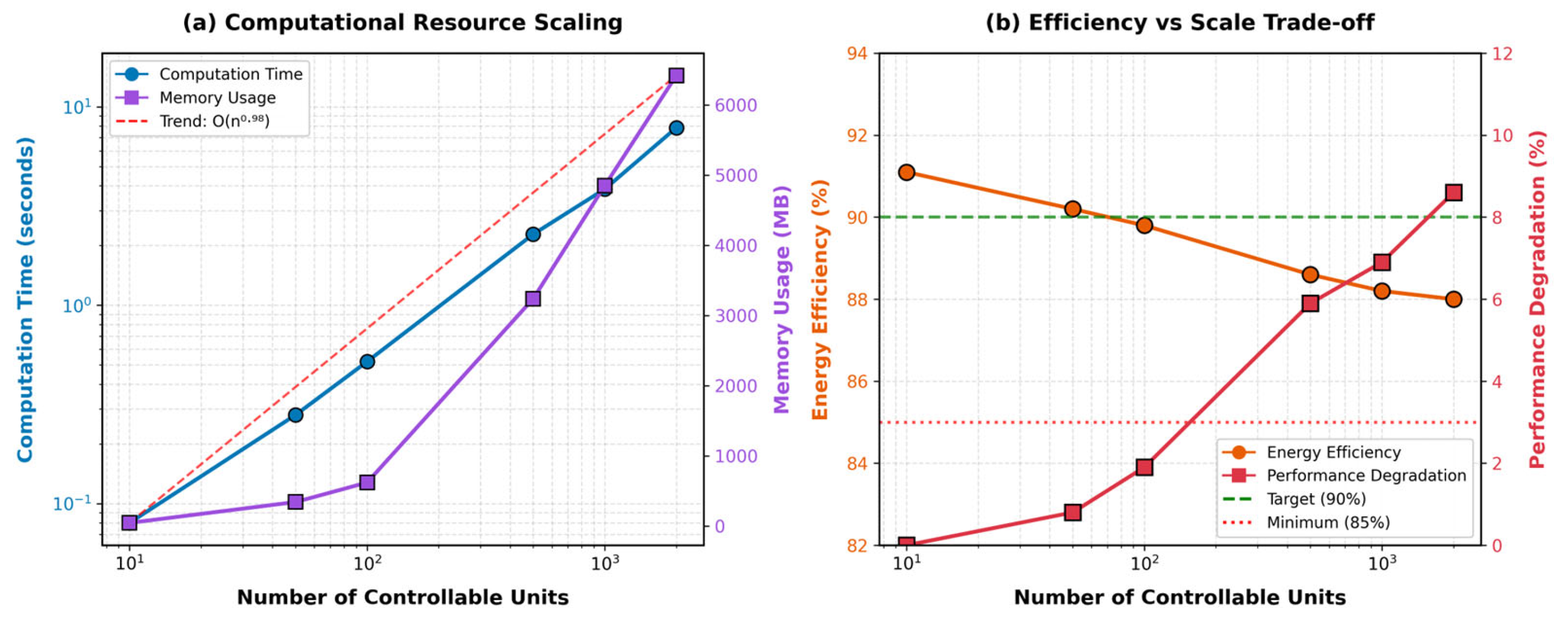 Figure 9 shows that GreenMind scales linearly in computation (O(n0.98)) and maintains high efficiency above 88% even at utility scale (2000 controllable units). Performance degradation stays below 9% under load.