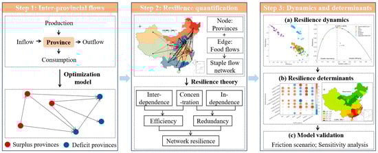 Based on the above analysis, the main novelty and contribution of this paper can be summarized as follows. (1) Incorporation of international import in staple-specific flow estimation. Due to the lack of publicly available inter-provincial food flow data in China, this study employs a mathematical programming approach to estimate provincial flows. During this process, imports and exports of each staple are incorporated, ensuring more accurate and realistic flow estimations. (2) Network-based assessment of CISFN resilience. This study evaluates the resilience of the CISFN from the systemic perspective. By adopting a network-oriented resilience framework, it provides a comprehensive and systematic understanding of inter-provincial food flow, thereby filling a research gap in resilience assessment within China’s domestic food flow system. (3) Identification and quantification of resilience determinants across staples. The study empirically identifies the key driving factors of CISFN resilience and reveals heterogeneity across staples. Using econometric techniques, it further quantifies the relative contributions of these determinants, offering deeper insights into the resilience mechanisms of various staples.
