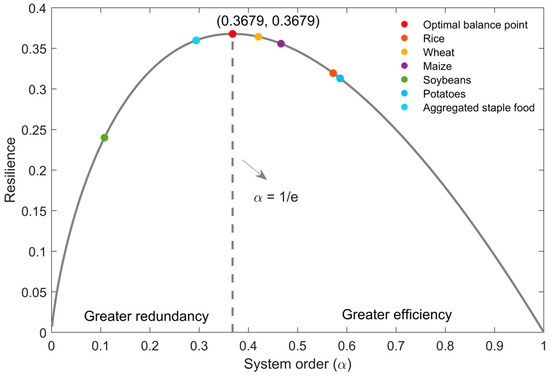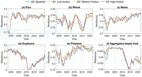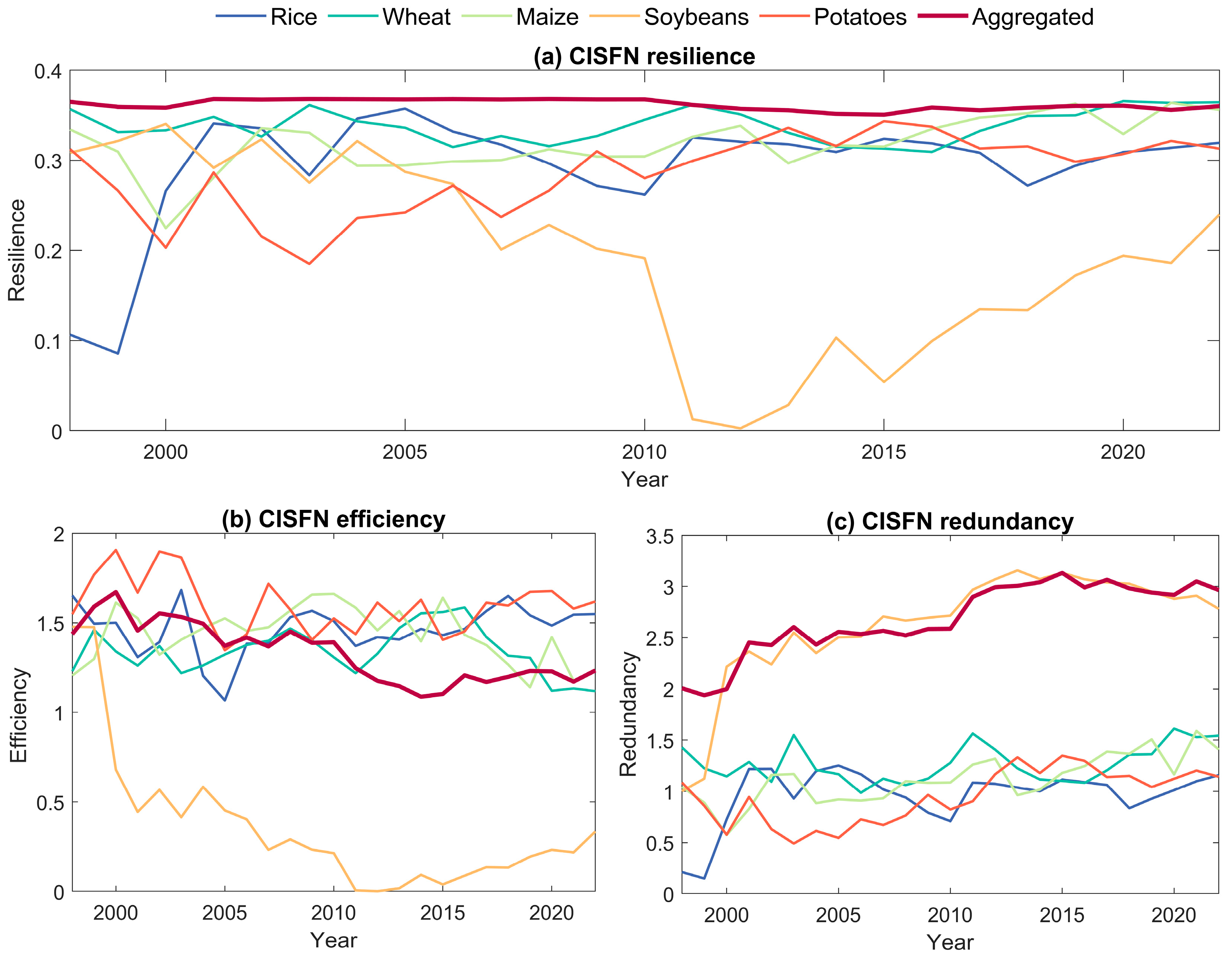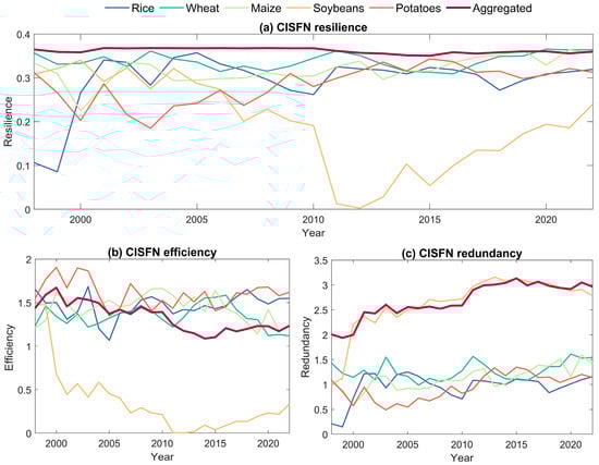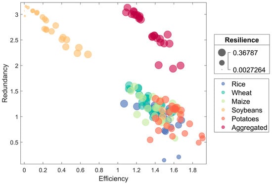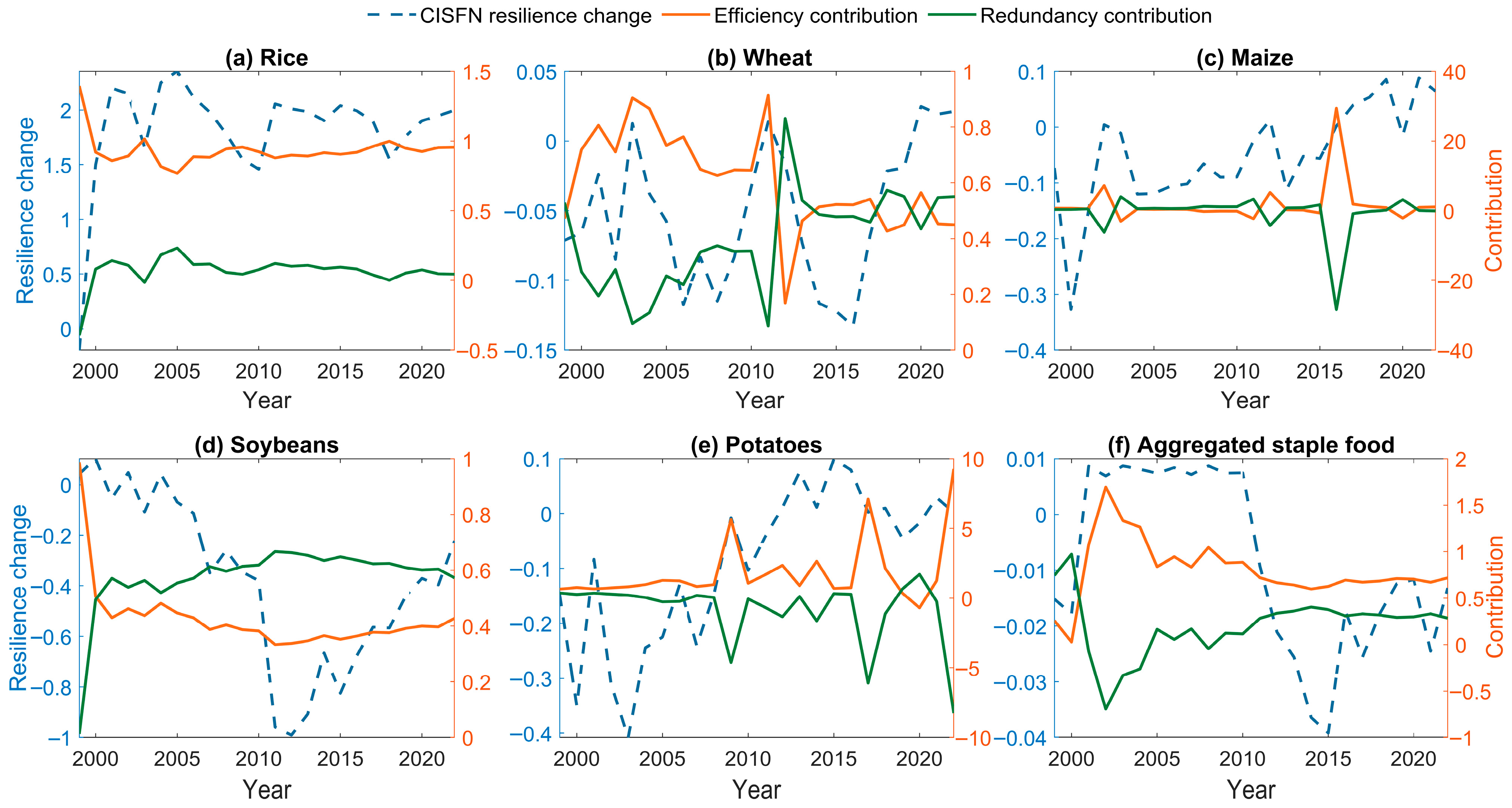 43]. For the aggregated staple food, resilience changes are relatively moderate, with the contributions of efficiency and redundancy remaining largely stable.
